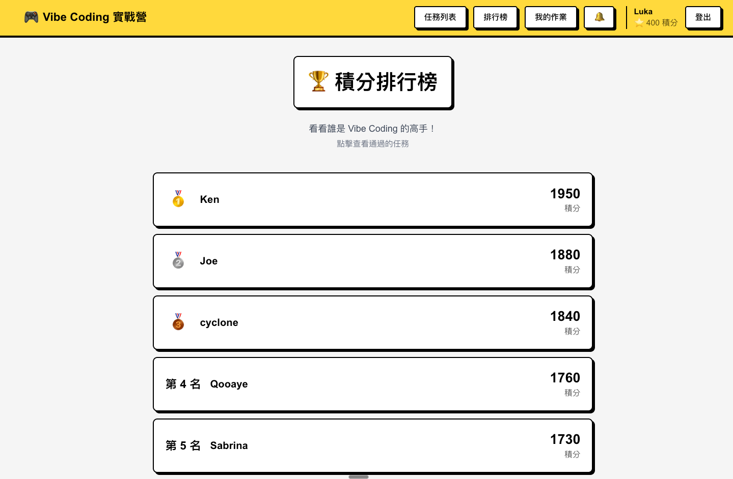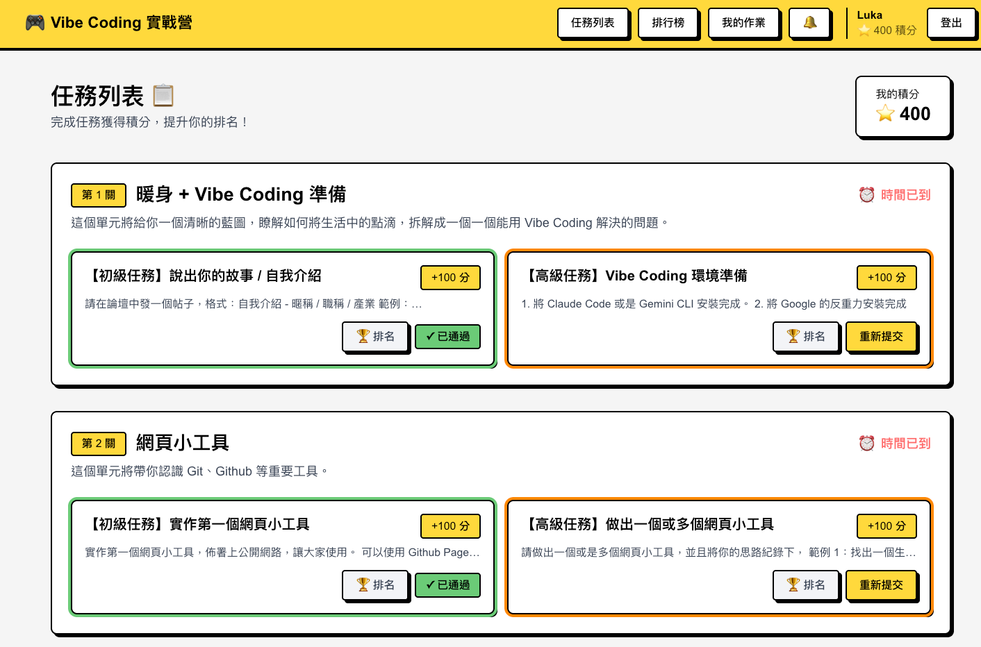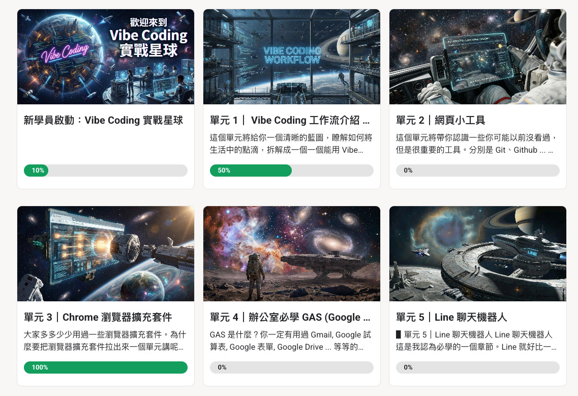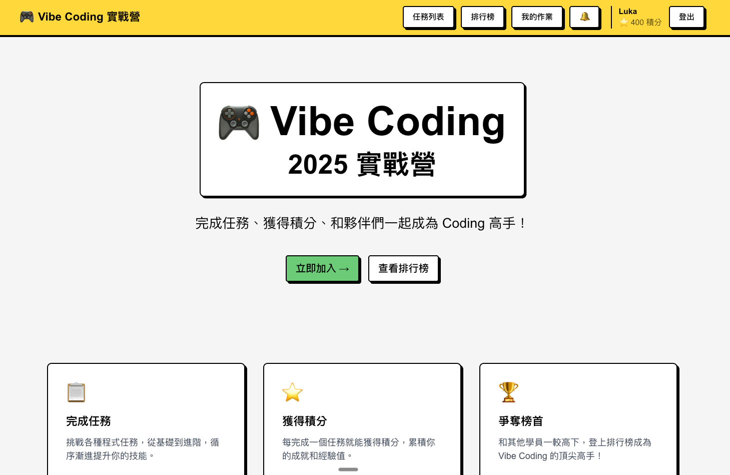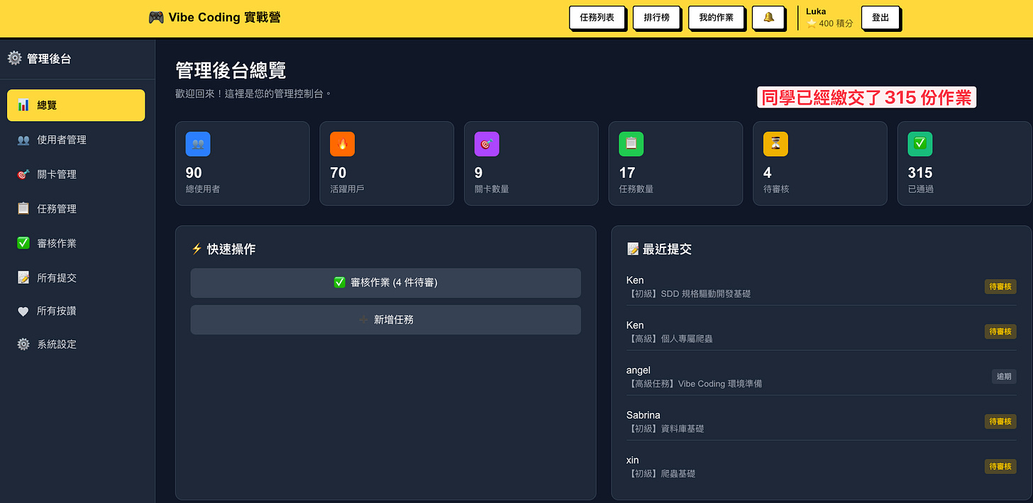 為此,我開發了一套 Vibe Coding 遊戲化平台,讓大家可以在上面闖關、繳作業。